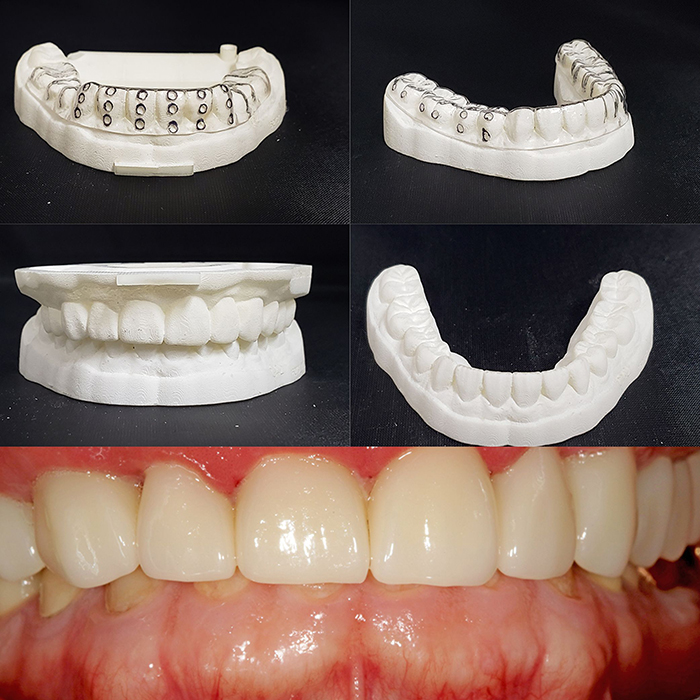 The dentist prepped, checking his preps with the reduction guides, back-filled the temps, and took final digital impressions and bite scans utilizing the temps in 3 sections.